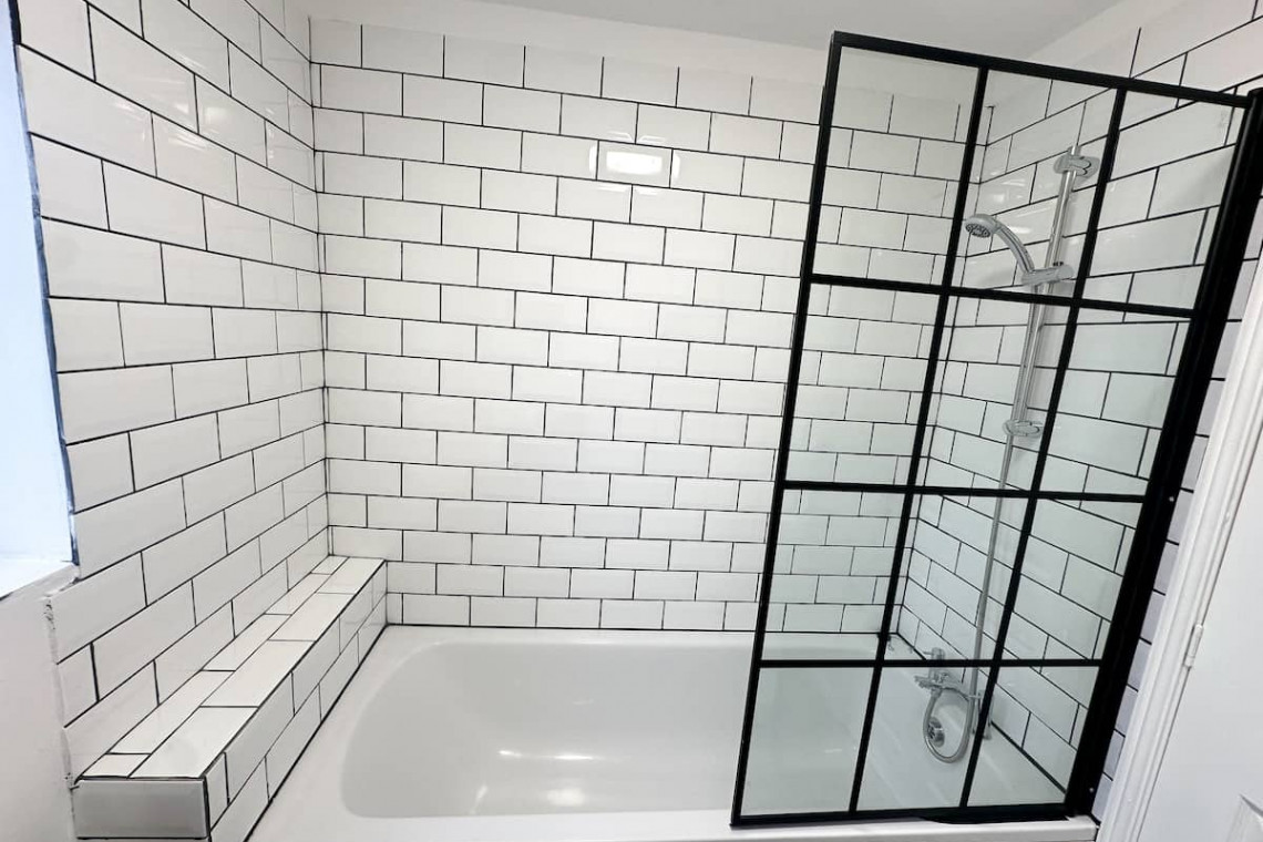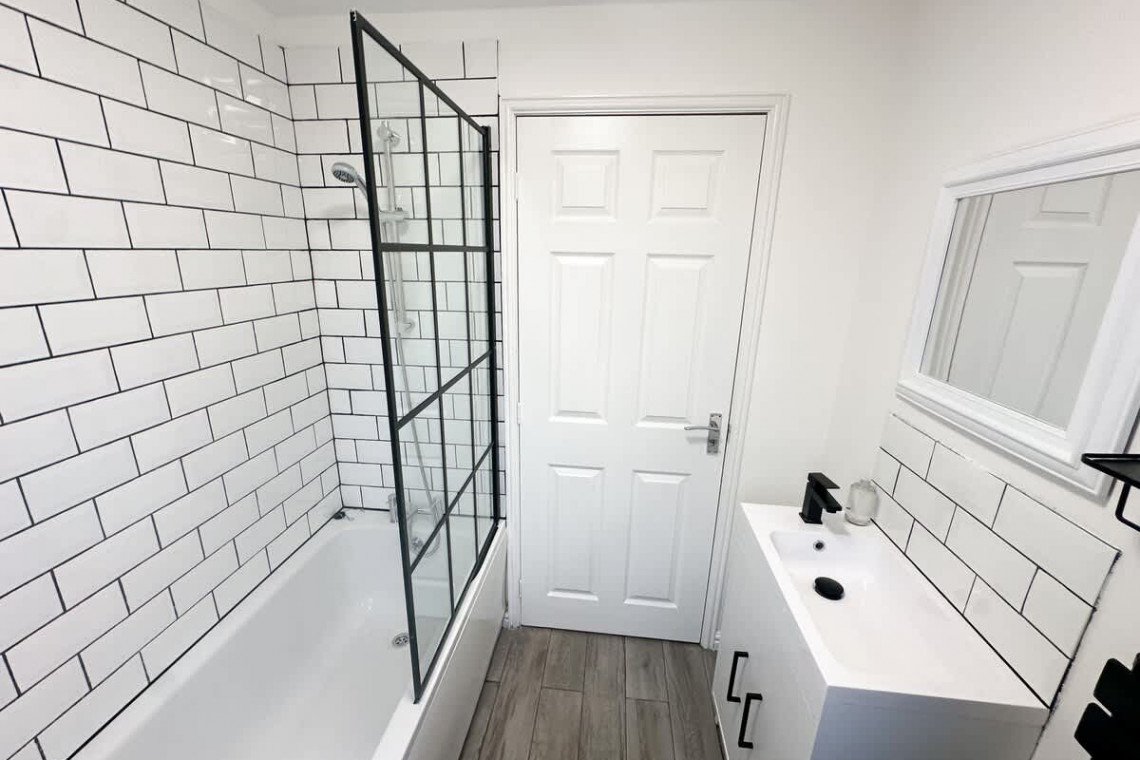 Our house has a main family bathroom which is a fresh and modern room, with plenty of space, including a bath with an overhead shower, a wash basin, and a WC.
