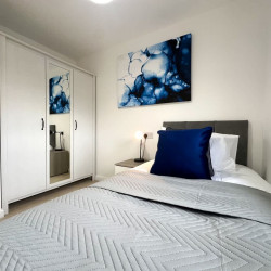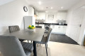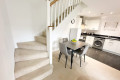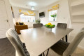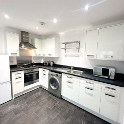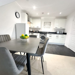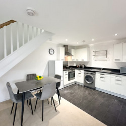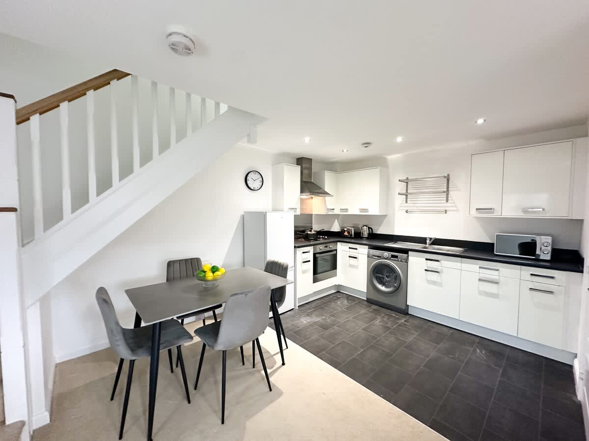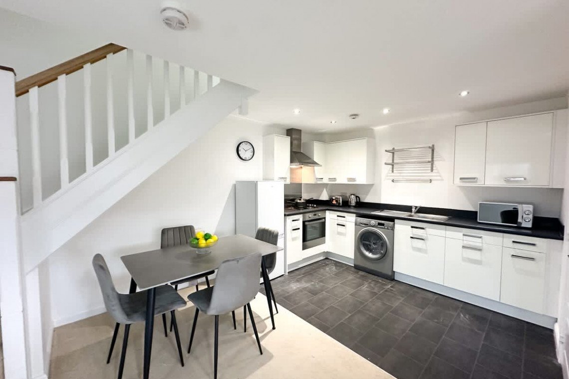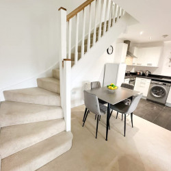 Bournville House boasts a clean modern white kitchen which is fully equipped for self-catering stays. Here you can make use of an oven, hob, microwave, fridge freezer, kettle, toaster and washing machine. The dining table has space for 4 guests. On the ground floor, there is a WC for convenience.