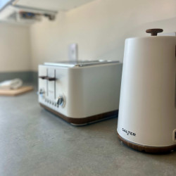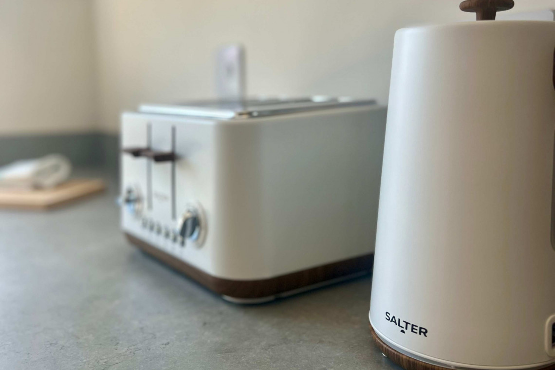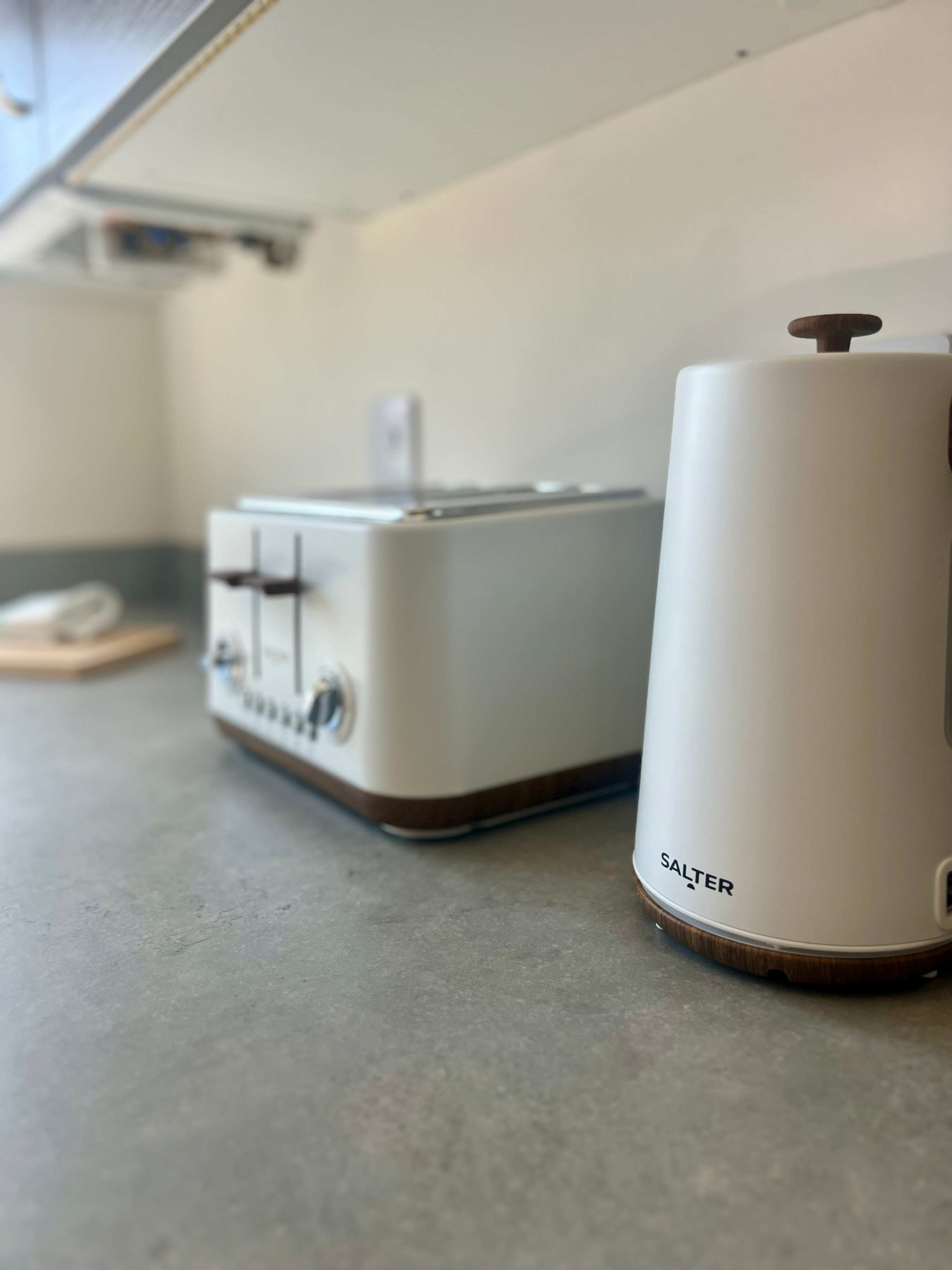 The open-plan kitchen and dining area is fully equipped with everything needed for cooking and dining in, including an oven, hob, microwave, fridge/freezer, kettle, toaster, and washing machine.