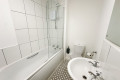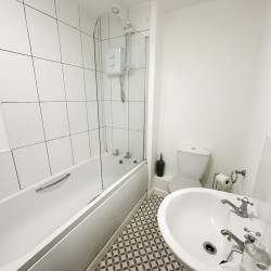 The contemporary bathroom is home to a bath with a large overhead shower, basin & WC.