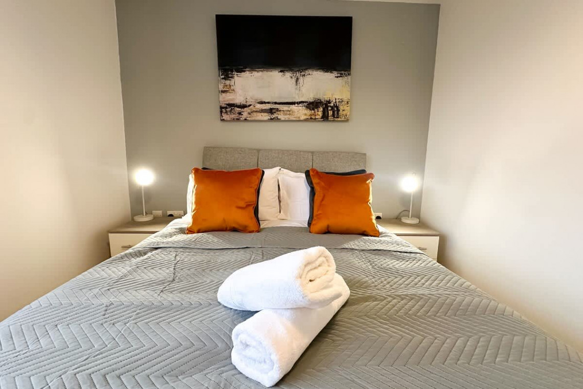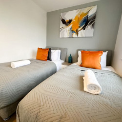Up the stairs is home to two bedrooms. One bedroom is home to a comfy double bed and the other has two singles. Both bedrooms come with storage for your belongings. All our beds come with premium cotton linen and plush bedding to ensure all guests have a good night’s sleep.
