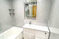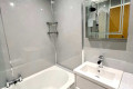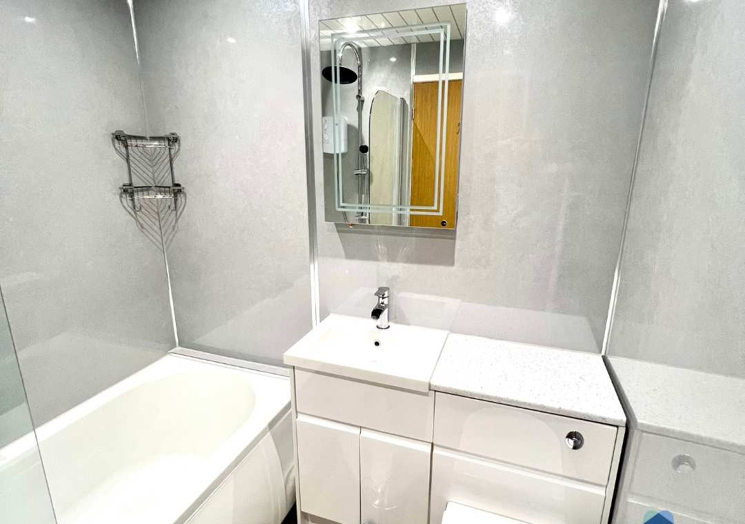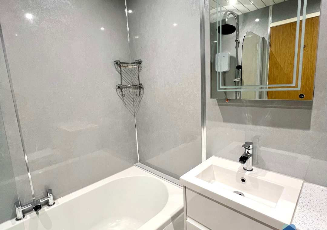 The modern family bathroom features a full-size bath and overhead shower, perfect for a relaxing soak or quick refresh. All essentials are provided, including fresh towels and complimentary toiletries.