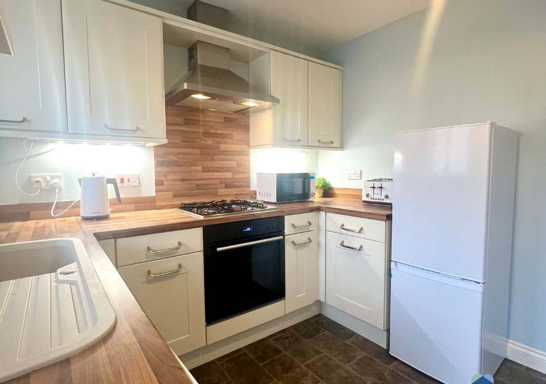 Oven, hob, microwave, fridge-freezer, kettle, toaster & utensils