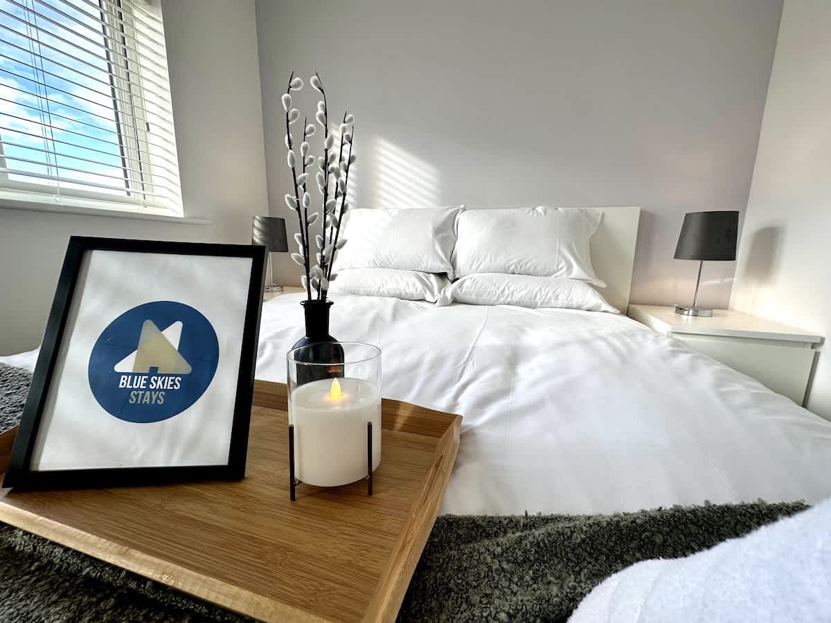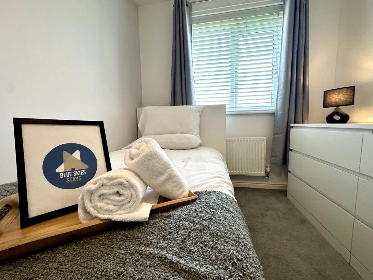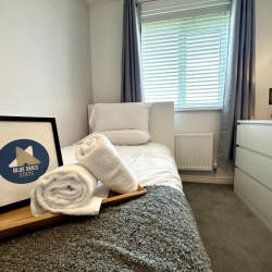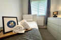 Upstairs you’ll find three bedrooms. The master bedroom boasts a comfortable king-size bed with wardrobe space & drawers for your belongings. The second & third bedrooms both have single beds and ample storage. Each bed has crisp, white bed linens and bedding to ensure you get a great night’s sleep.