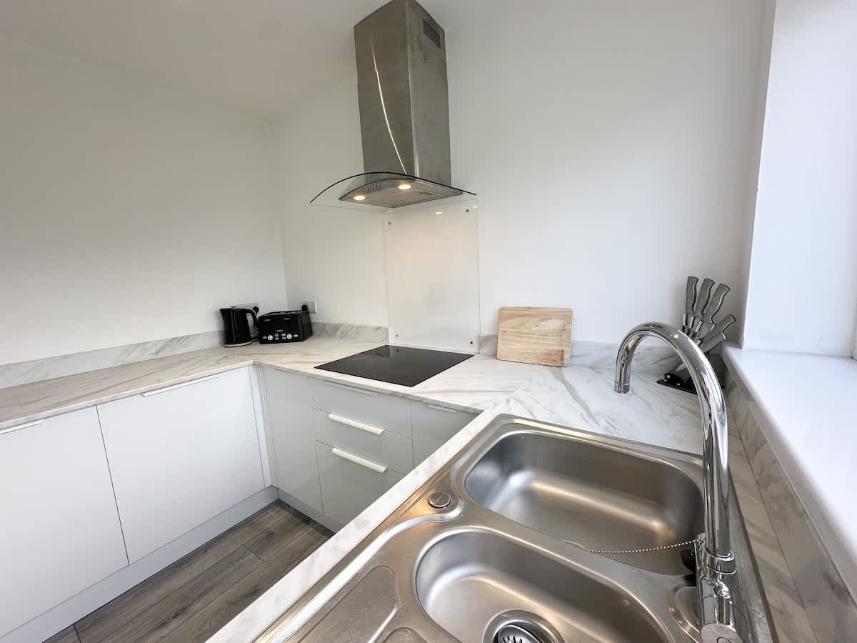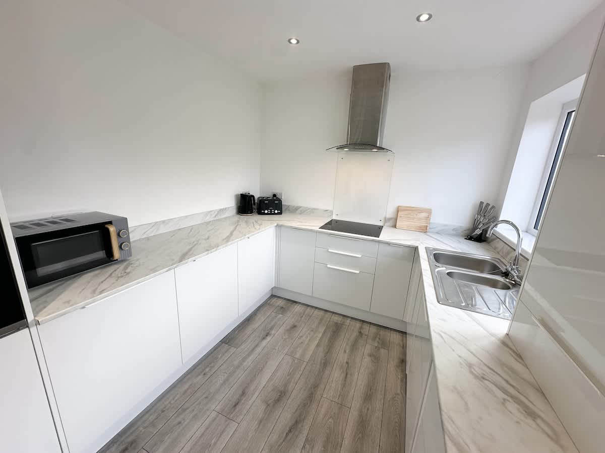 The kitchen in Harbour House is fully equipped for self-catering stays. Amenities include an oven, hob, microwave, kettle, toaster and fridge freezer so you can prepare your favourite home-cooked meals during your stay. There is also a washing machine, iron and ironing board for your convenience.