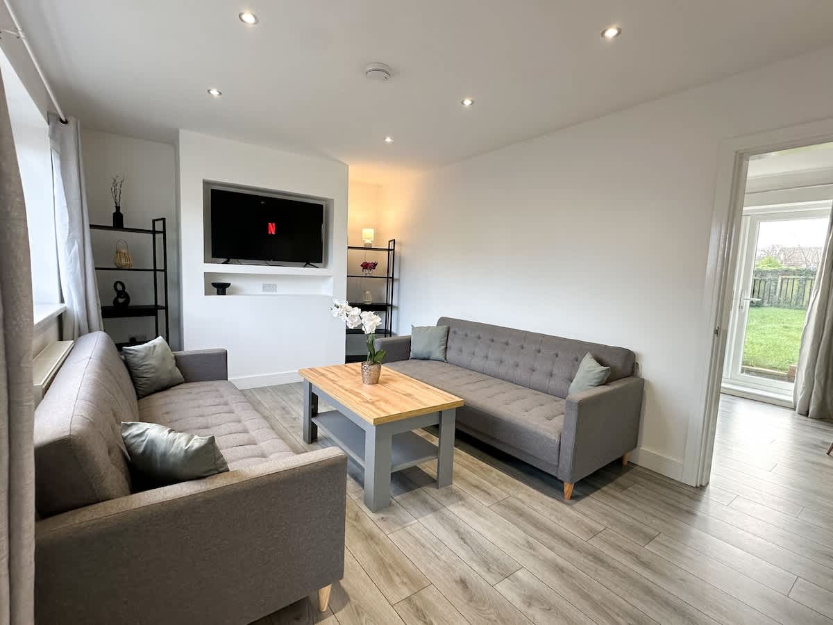 The cosy living area is a great spot to unwind, with two sofas and a flat-screen smart TV to keep up with your favourite shows, making you feel at home away from home.