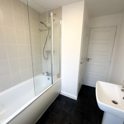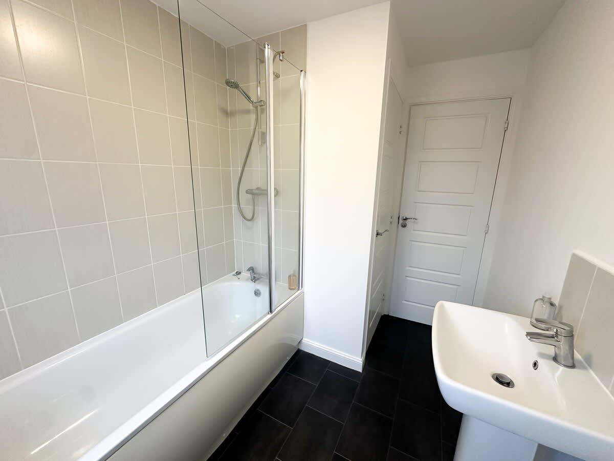 The main bathroom suite is complete with a bath, overhead shower, a wash basin and WC.