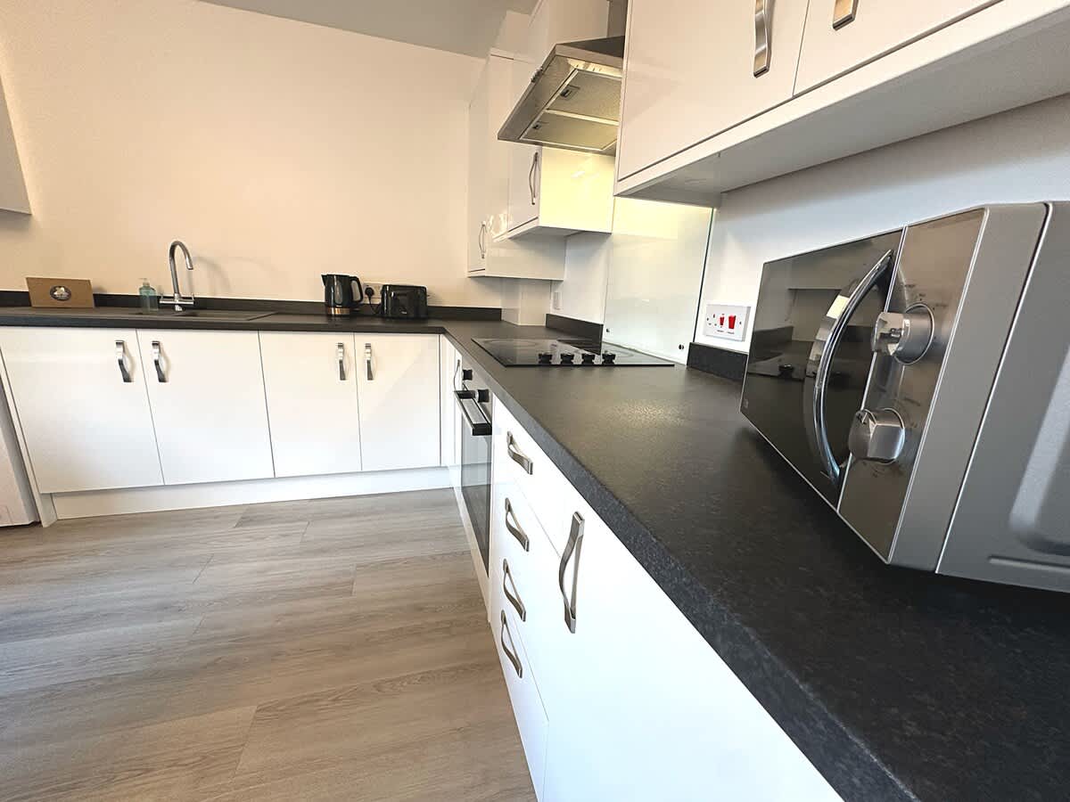 The integrated kitchen has everything you could need for a comfortable self-catered stay including an oven, hob, fridge, freezer, microwave, kettle, toaster and washing machine.