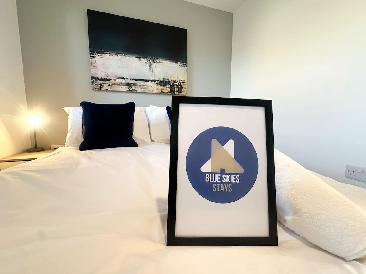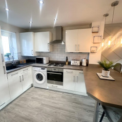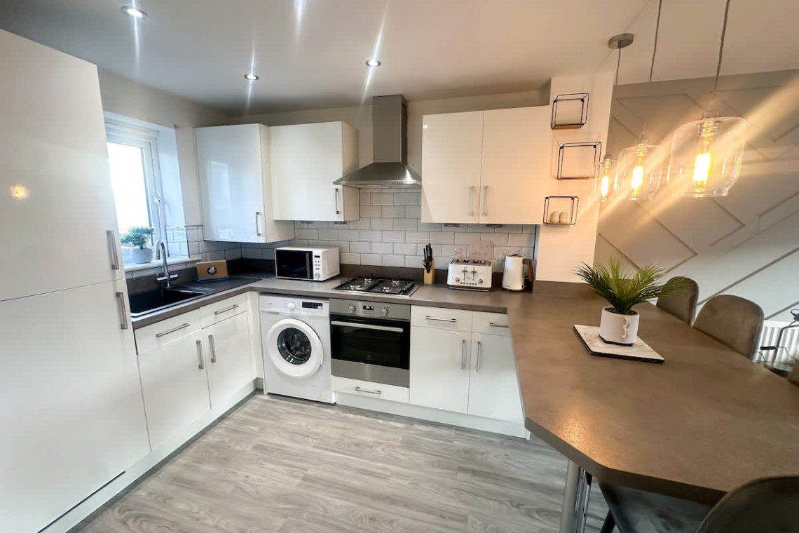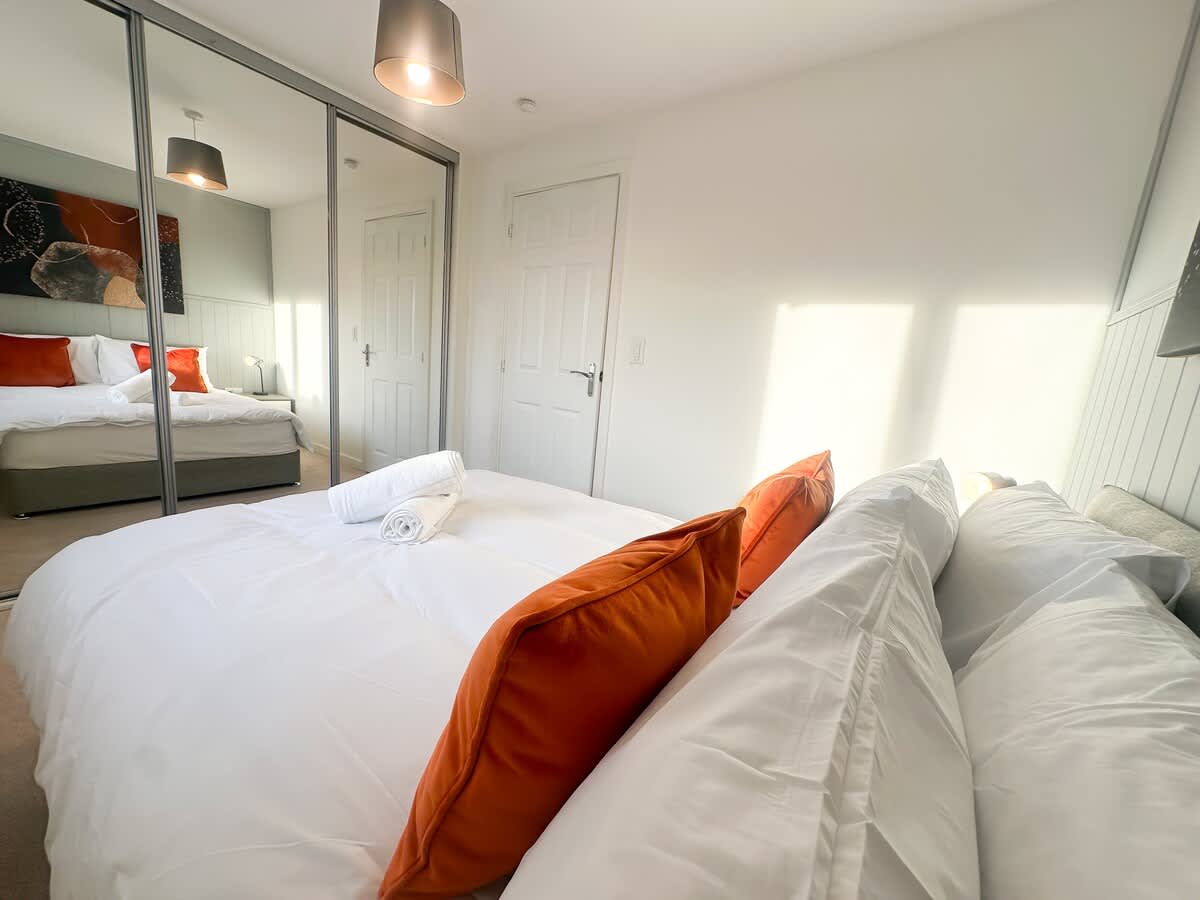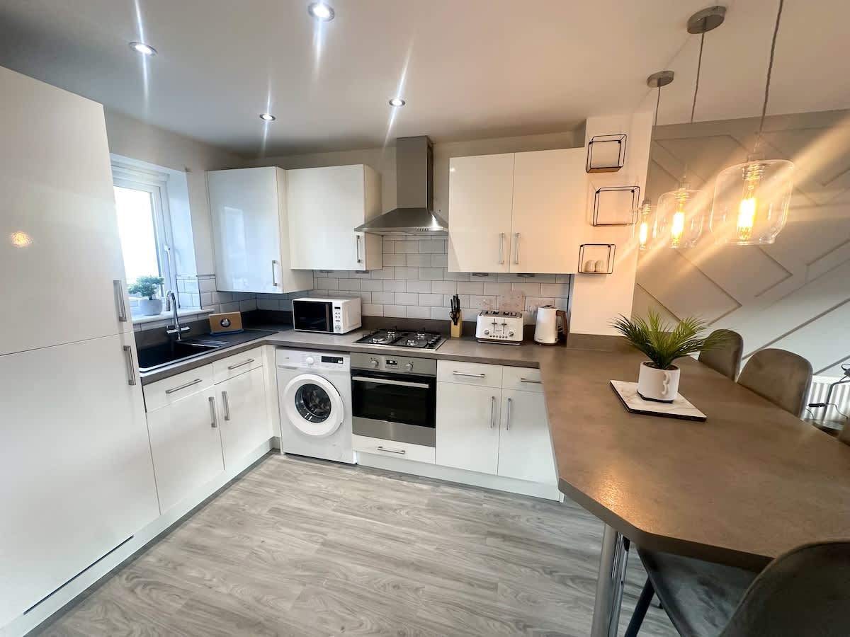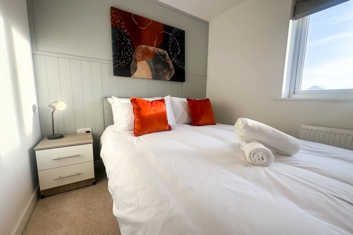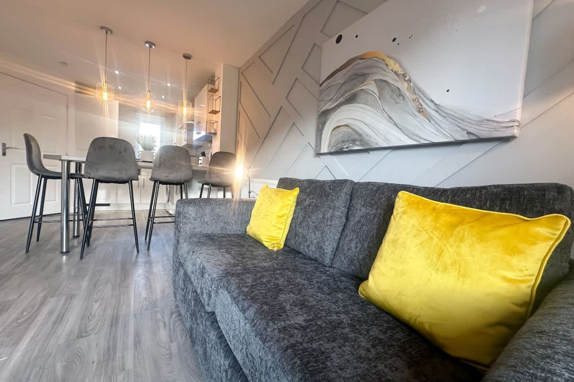 The open-plan kitchen living is a comfortable bright & airy space. The space includes a modern white kitchen with all the appliances and basics you may need for your self-catered stay. With seating at the breakfast bar for 4 to enjoy your home-cooked meals. The living room joins the space that has a comfy sofa and smart TV, ideal to kick back and relax in front of after a busy day out.