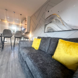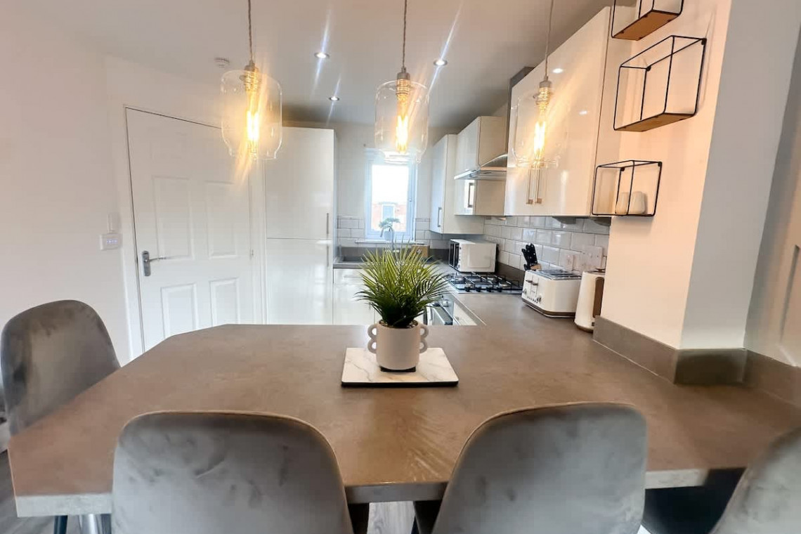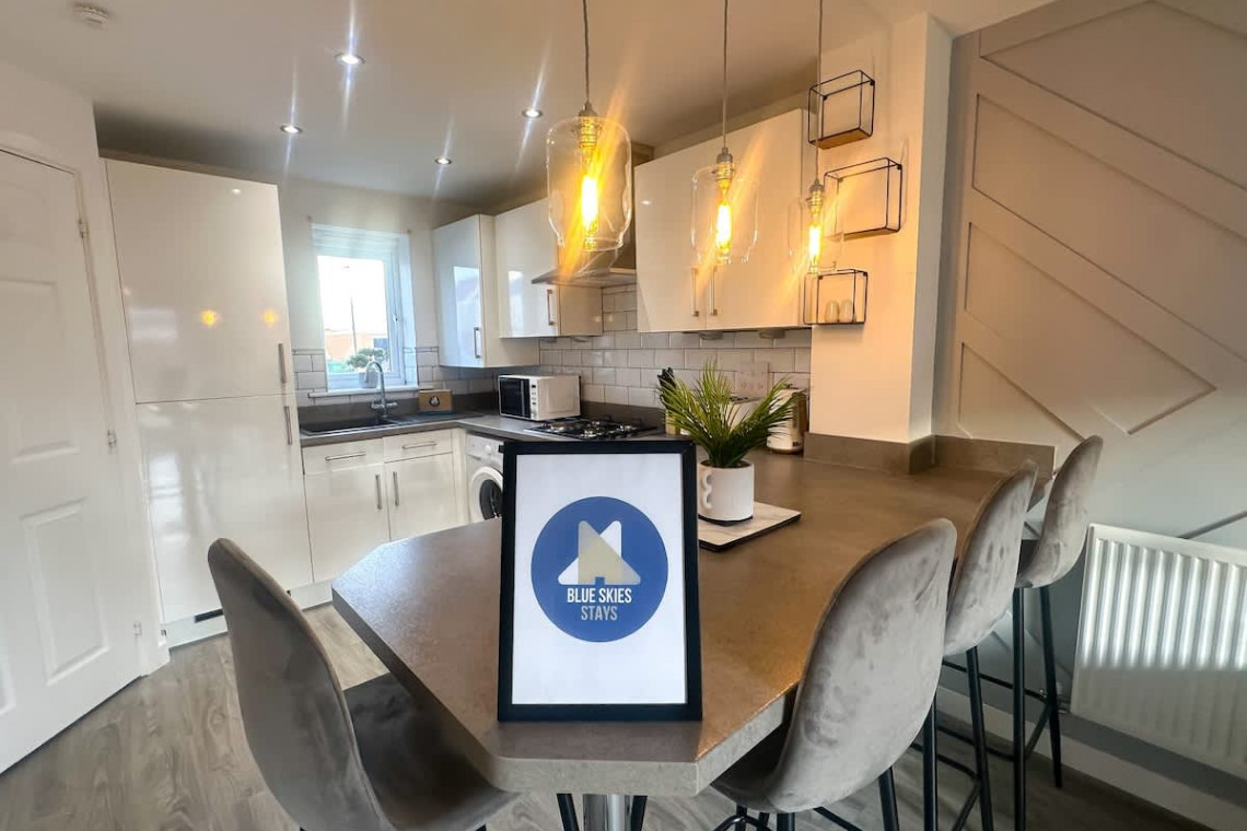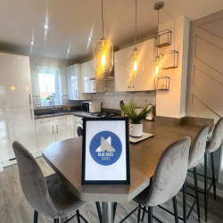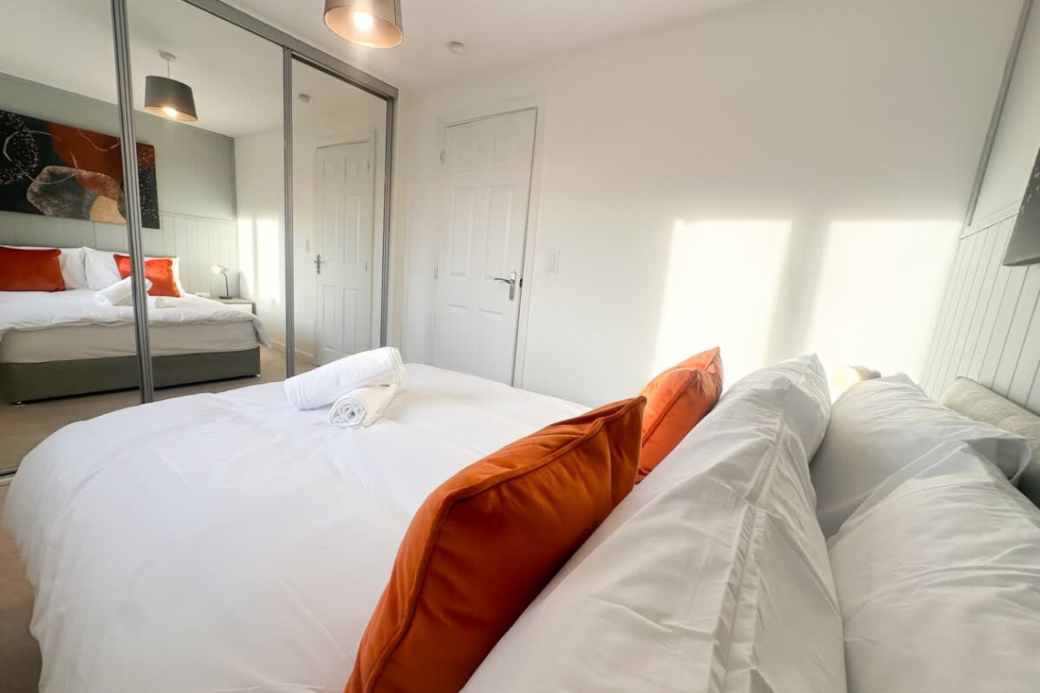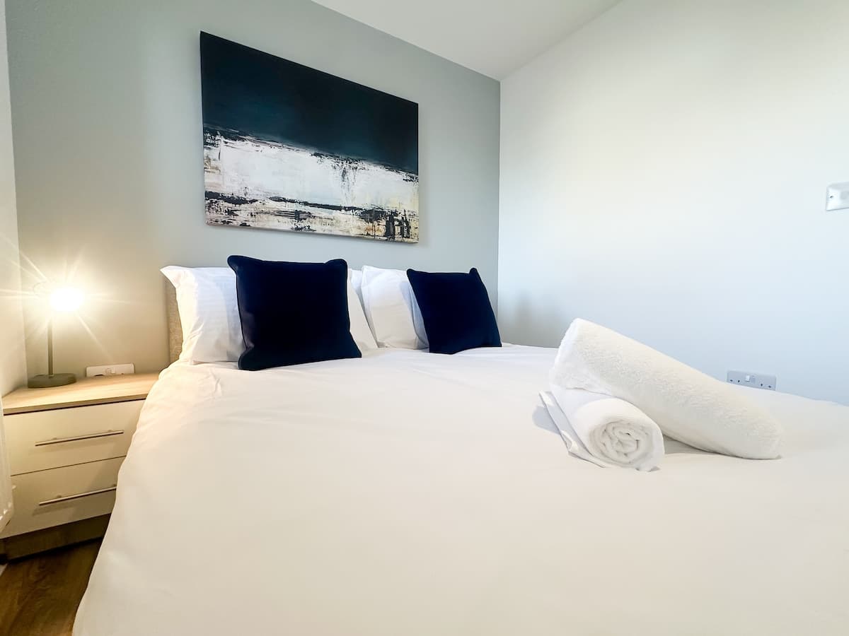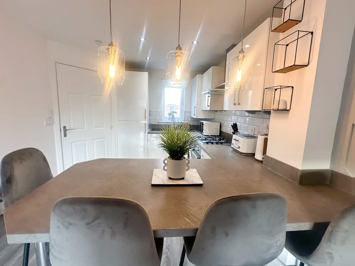 The open-plan kitchen living is a comfortable bright & airy space. The space includes a modern white kitchen with all the appliances and basics you may need for your self-catered stay. With seating at the breakfast bar for 4 to enjoy your home-cooked meals. The living room joins the space that has a comfy sofa and smart TV, ideal to kick back and relax in front of after a busy day out.