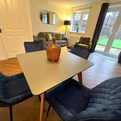 Through to the living room, there is comfy seating, a large smart TV and a second dining table. The ground floor WC is also located in this area.