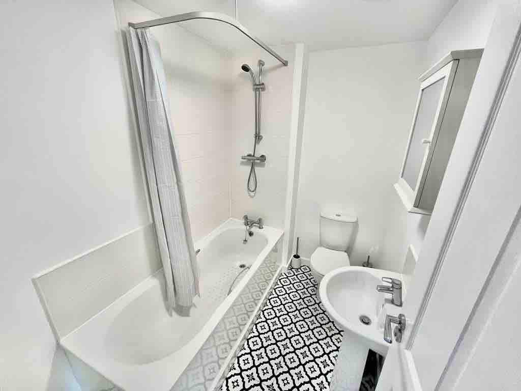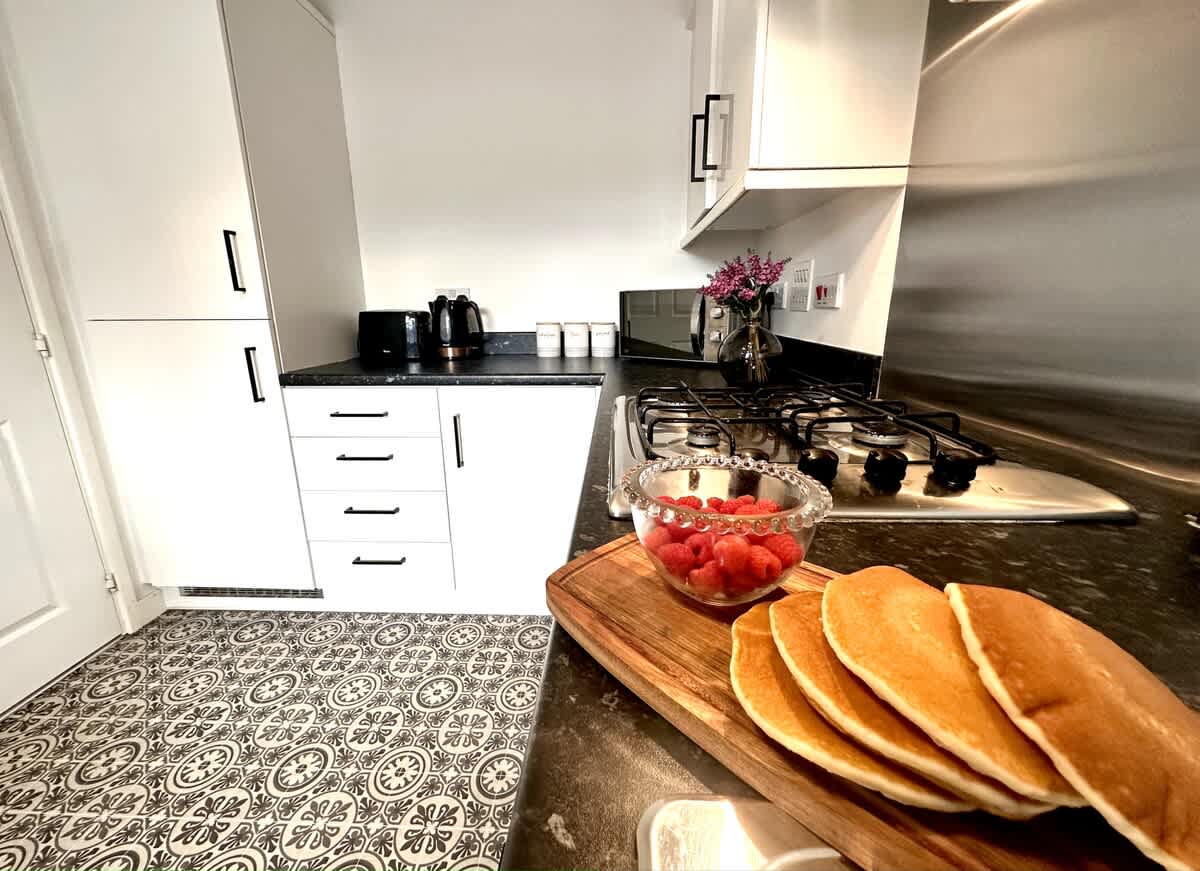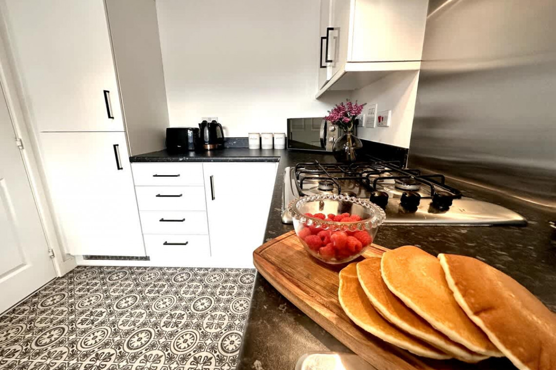 The kitchen is equipped with integrated appliances and has everything you could need including an oven, hob, fridge, freezer, microwave, kettle, toaster and washing machine for your stay.